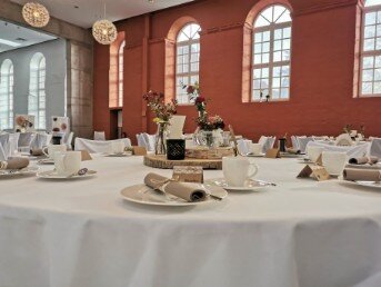- Gern werden Tischdecken in modischen Farben angefragt. Dies ist aber nur begrenzt möglich. Farbakzente kann man ganz einfach mit farbigen Tischläufern, Schleifenbändern, Servietten oder Organza setzen.